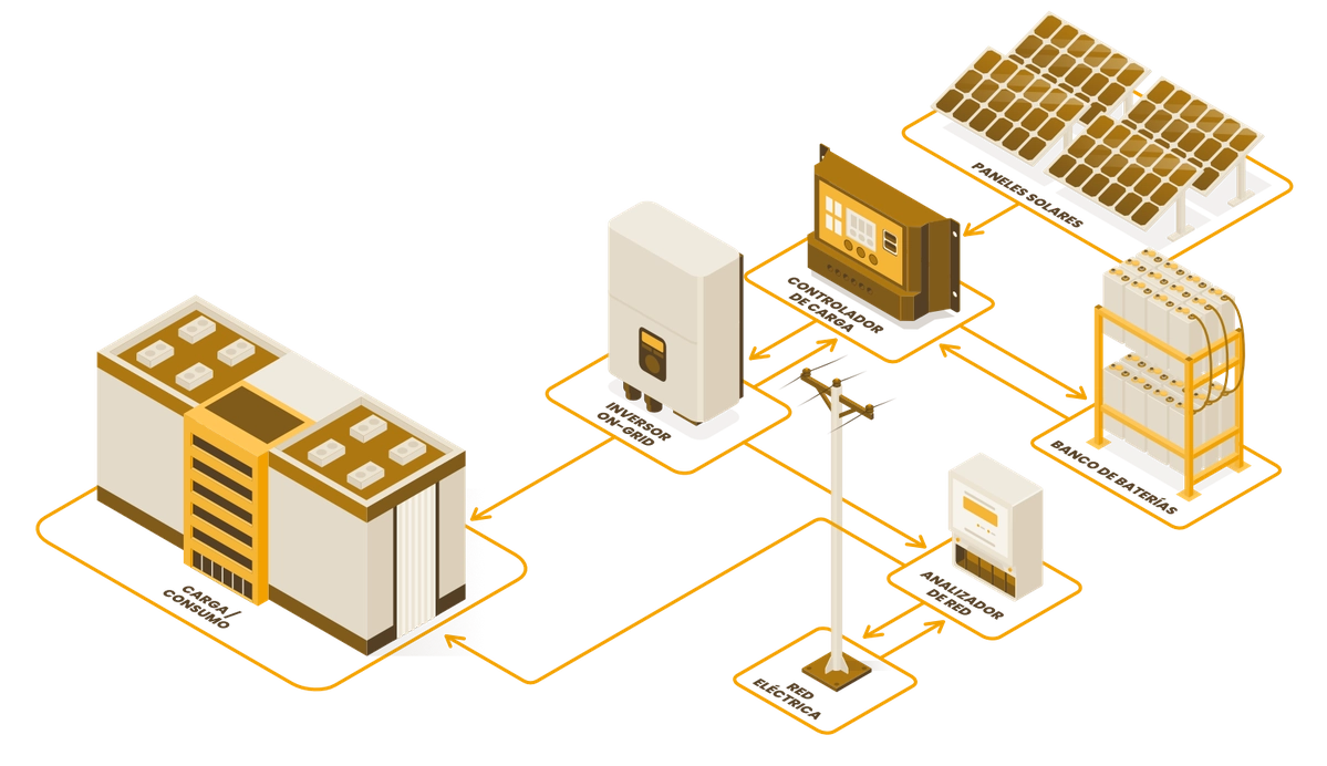 Un sistema híbrido es un sistema on-grid avanzado que incorpora la capacidad de almacenamiento en baterías. Su inteligencia le permite gestionar múltiples fuentes: prioriza el autoconsumo directo y utiliza el excedente solar para cargar las baterías, en lugar de verterlo todo a la red. Por la noche, o en picos de demanda, la industria se alimenta de la energía almacenada, maximizando el autoconsumo y recurriendo a la red solo como último recurso. Su gran ventaja estratégica es la resiliencia: en caso de un apagón, el sistema puede seguir operando en modo aislado, alimentando los consumos críticos del negocio y garantizando la continuidad operativa mientras se evitan emisiones de gases de efecto invernadero.