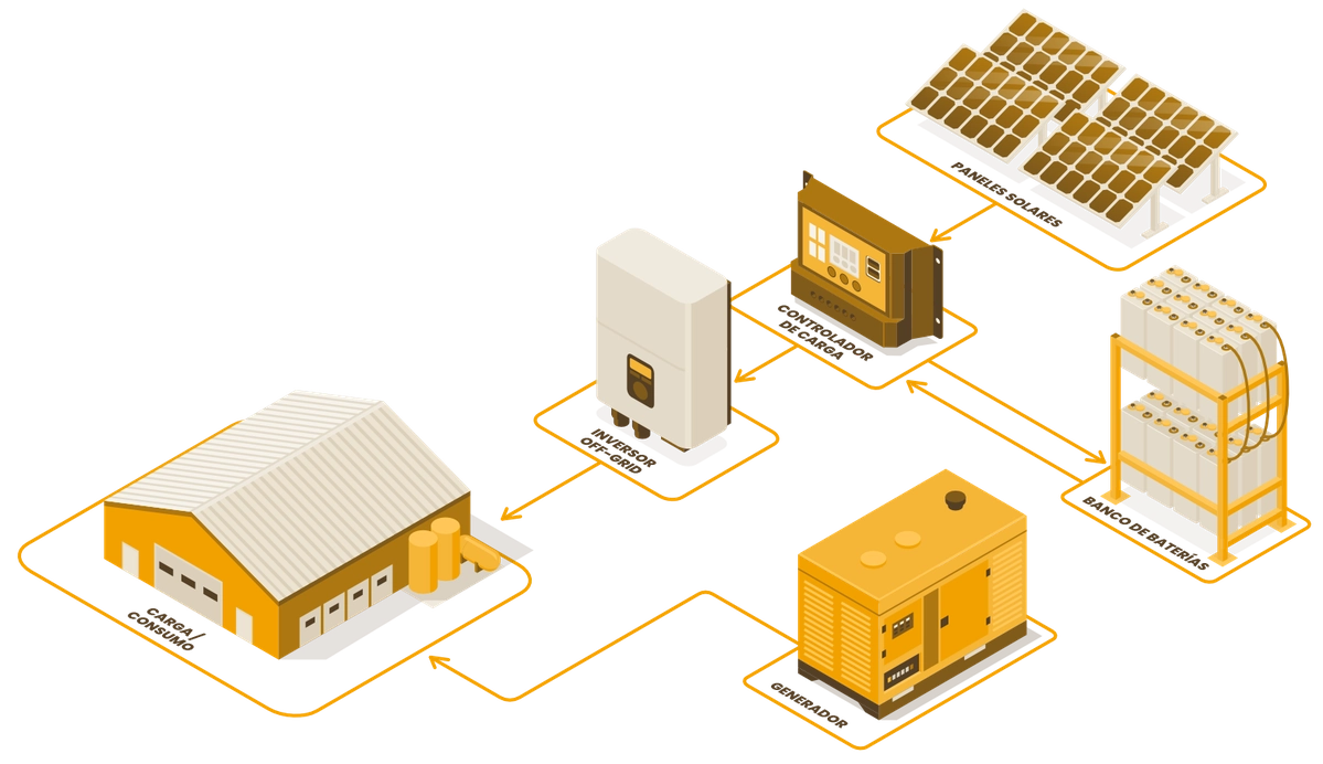 Un sistema off-grid o aislado está diseñado para la independencia total, ya que no tiene conexión alguna con la red eléctrica. Los paneles solares generan electricidad que se almacena en un banco de baterías, actuando como un depósito de energía limpia. El inversor toma esta energía almacenada de las baterías y la transforma en corriente alterna para alimentar los consumos de la industria. Este sistema requiere un dimensionamiento preciso de los paneles y las baterías para garantizar la autonomía necesaria, cubriendo toda la demanda energética del emplazamiento, incluso durante la noche o en días de baja radiación solar.