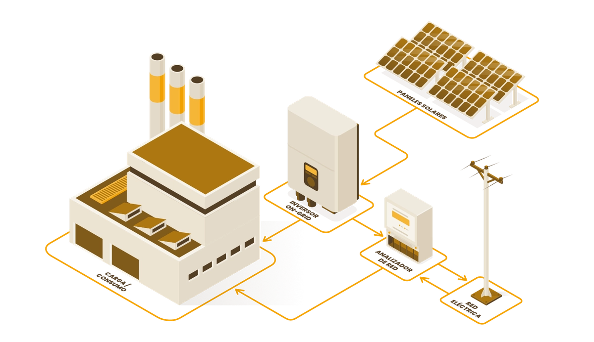 Un sistema on-grid o de autoconsumo conectado opera en paralelo con la red eléctrica. Los paneles solares generan electricidad que el inversor convierte para ser consumida instantáneamente por la industria. Si la producción solar supera la demanda de la empresa en ese momento, el excedente de energía se vierte a la red, generando una compensación en la factura. Por el contrario, cuando la demanda es mayor que la producción solar, o durante la noche, el sistema toma automáticamente la electricidad que necesita de la red. De esta forma, se garantiza un suministro estable e ininterrumpido, priorizando siempre el ahorro y la reducción de la huella de carbono.